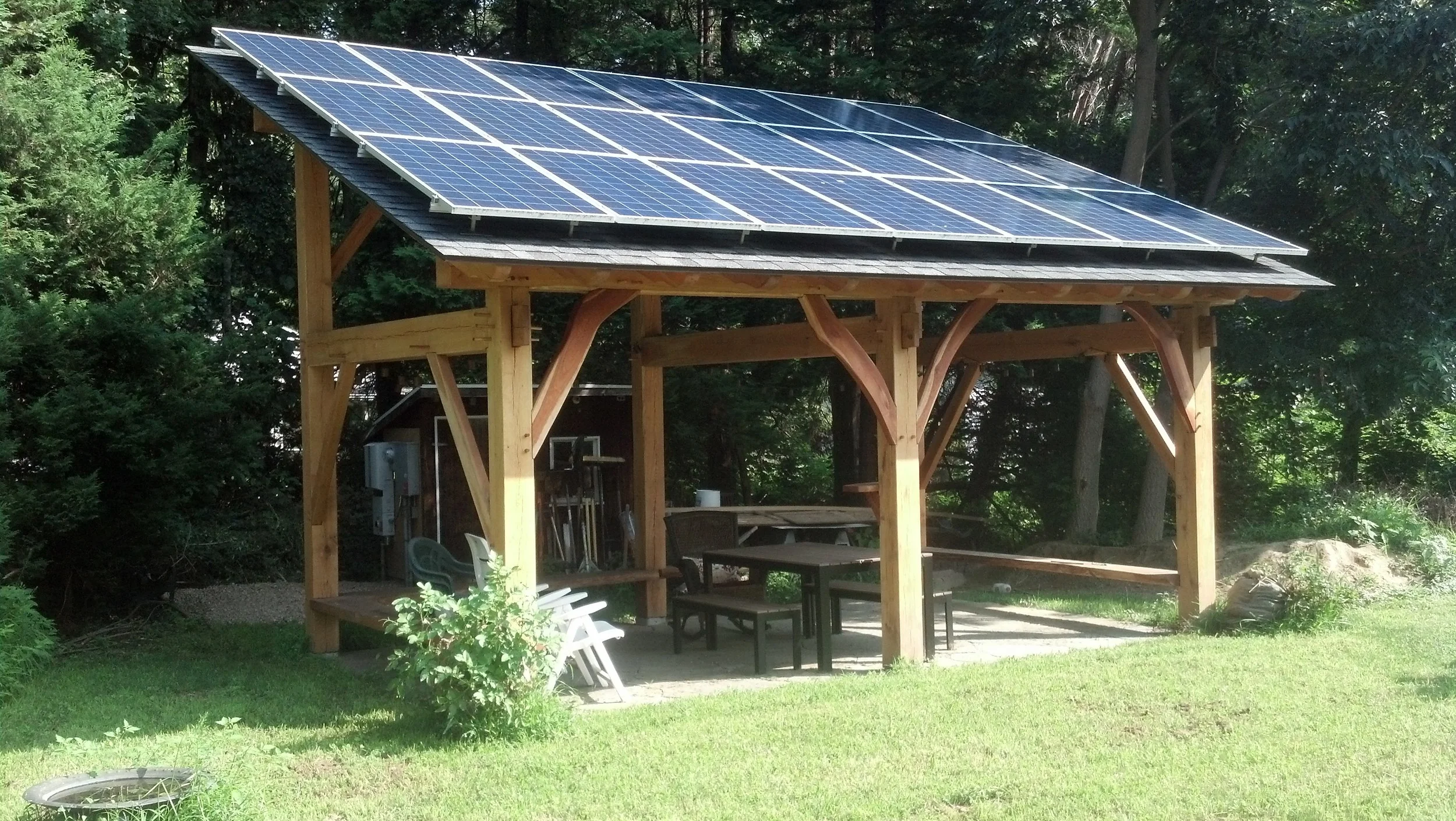 Pavilion that holds a photovoltaic array in a client's backyard in Amherst, MA.